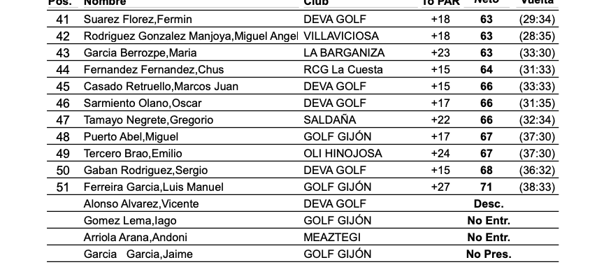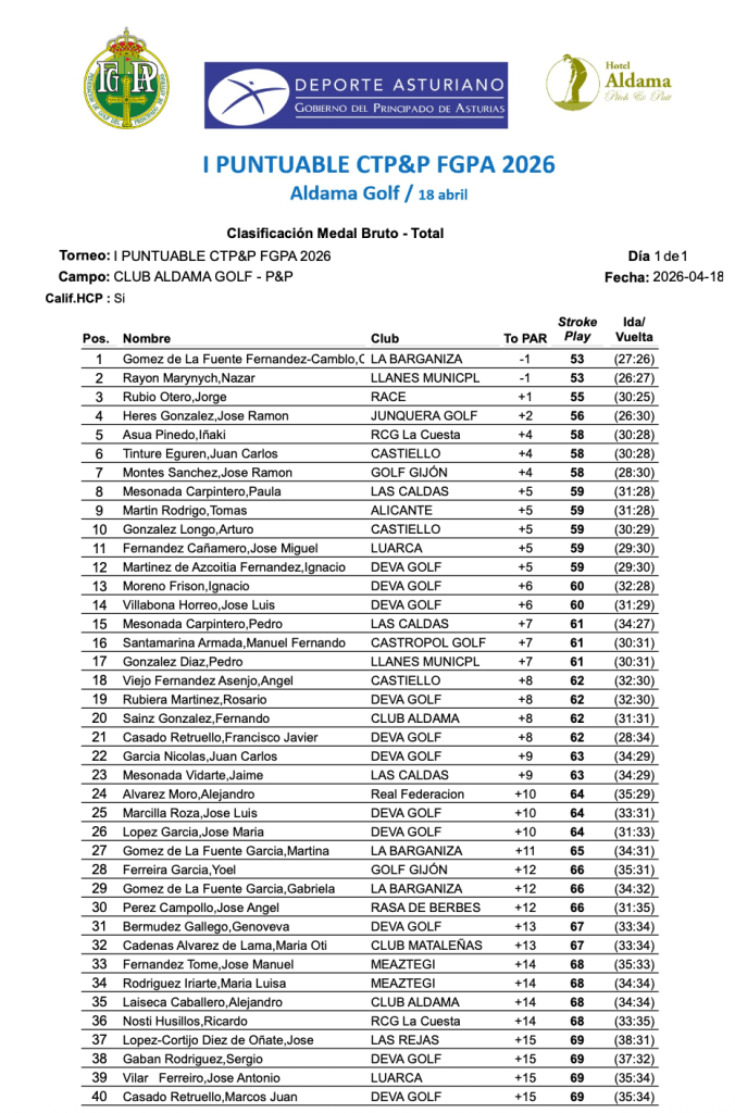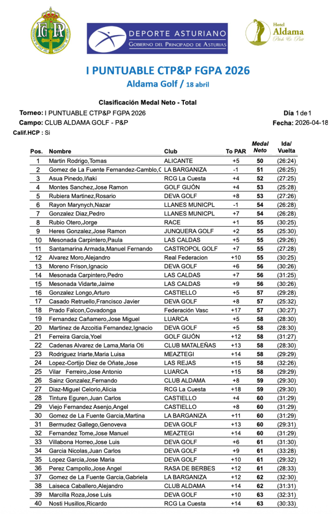 Cesar Gomez de la Fuente se alza con el I puntuable de P&P, prueba organizada por la FGPA en el recorrido de Aldama Golf, subcampeón el llanisco Nazar Rayon, en Handicap, el jugador de Alicante Tomas Martin es el nuevo campeón, el subcampeonato fue para Cesar Gomez de la Fuente