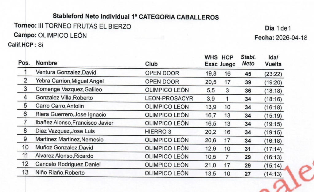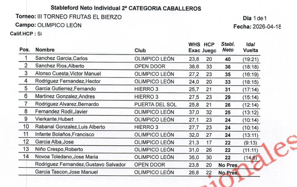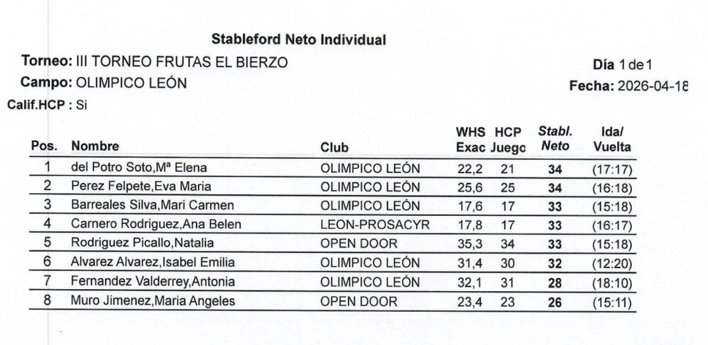 RESULTADOS III TORNEO DE GOLF FRUTAS EL BIERZO / OLIMPICO DE LEON por Golf por Asturias en 18 abril, 2026 CATEGORIA DAMAS 1ª CATEGORIA CABALLEROS 2ª CATEGORIA CABALLEROS https://www.facebook.com/reel/1354357126501498 Compártelo: Compartir en X (Se abre en una ventana nueva) X Comparte en Facebook (Se abre en una ventana nueva) Facebook Me gusta Cargando...