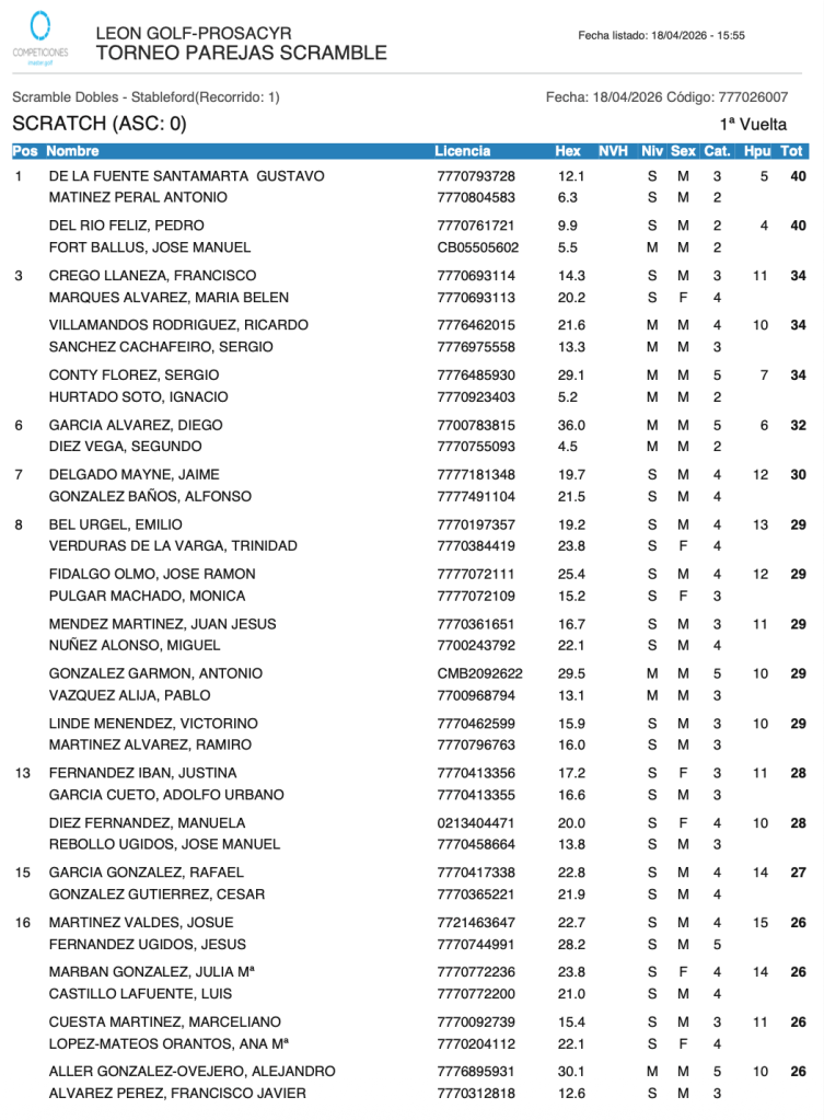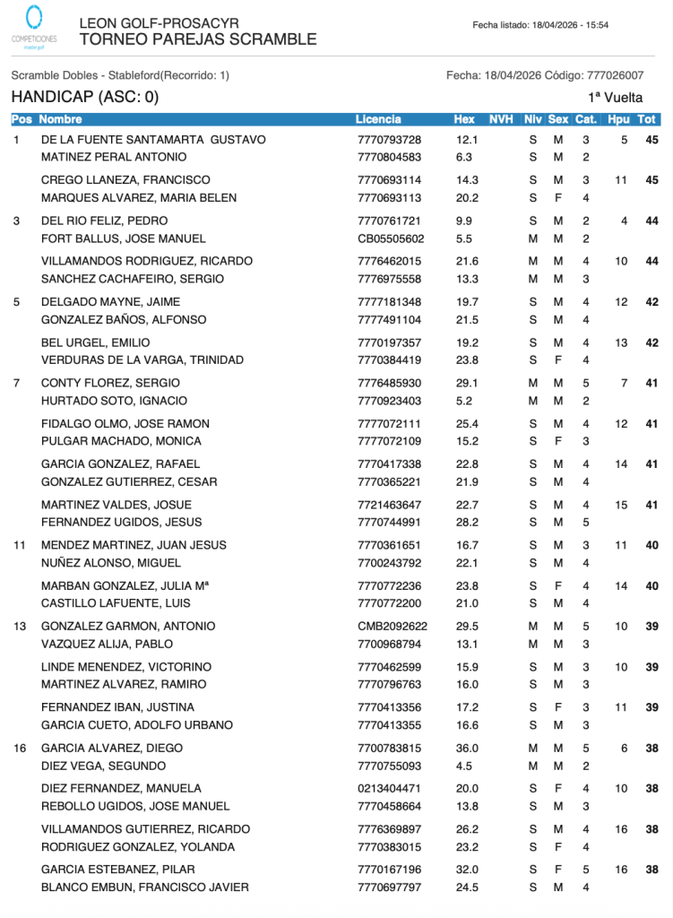 RESULTADOS TORNEO PAREJAS SCRAMBLE / LEON GOLF por Golf por Asturias en 18 abril, 2026 CLASIFICACION HANDICAP CLASIFICACION SCRATCH Compártelo: Compartir en X (Se abre en una ventana nueva) X Comparte en Facebook (Se abre en una ventana nueva) Facebook Me gusta Cargando...