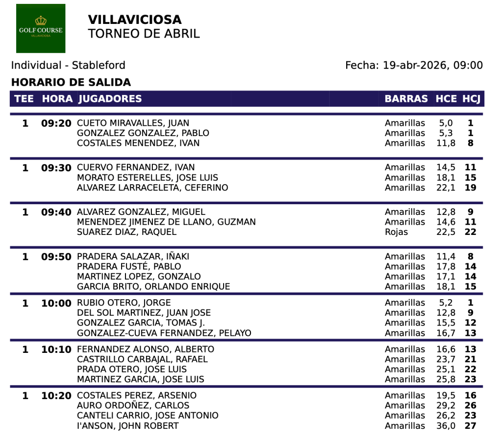 SALIDAS DOMINGO TORNEO ABRIL 2026 / GOLF COURSE VILLAVICIOSA por Golf por Asturias en 18 abril, 2026 Compártelo: Compartir en X (Se abre en una ventana nueva) X Comparte en Facebook (Se abre en una ventana nueva) Facebook Me gusta Cargando...