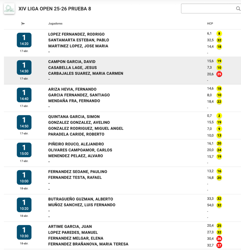SALIDAS VIERNES Y SABADO 8ª JORNADA XIV LIGA OPEN 25/26 – CIERRO GRANDE GOLF por Golf por Asturias en 18 abril, 2026 Compártelo: Compartir en X (Se abre en una ventana nueva) X Comparte en Facebook (Se abre en una ventana nueva) Facebook Me gusta Cargando...