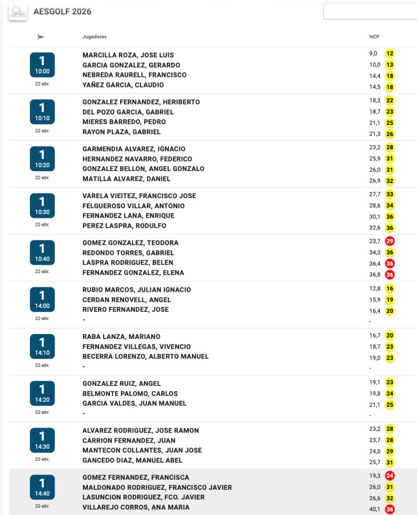 SALIDAS MIERCOLES Y JUEVES TORNEO AESGOLF / CIERRO GRANDE GOLF por Golf por Asturias en 22 abril, 2026 SALIDAS MIERCOLES SALIDAS JUEVES Compártelo: Compartir en X (Se abre en una ventana nueva) X Comparte en Facebook (Se abre en una ventana nueva) Facebook Me gusta Cargando...