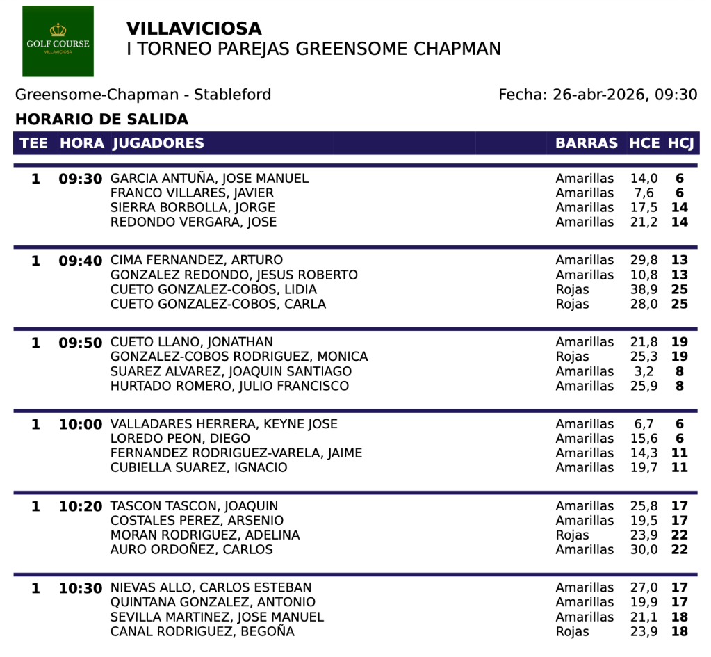 SALIDAS DOMINGO TORNEO PAREJAS 2026 / GOLF COURSE VILLAVICIOSA por Golf por Asturias en 25 abril, 2026 Compártelo: Compartir en X (Se abre en una ventana nueva) X Comparte en Facebook (Se abre en una ventana nueva) Facebook Me gusta Cargando...