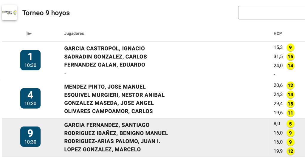 SALIDAS TORNEO 9 HOYOS ABRIL 2026 / CASTROPOL GOLF por Golf por Asturias en 25 abril, 2026 Compártelo: Compartir en X (Se abre en una ventana nueva) X Comparte en Facebook (Se abre en una ventana nueva) Facebook Me gusta Cargando...