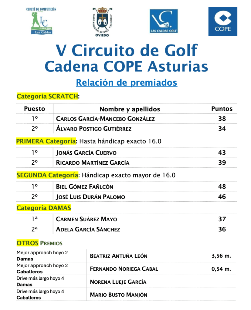 RESULTADOS V CIRCUITO GOLF CADENA COPE ASTURIAS 2026 / CM GOLF LAS CALDAS por Golf por Asturias en 26 abril, 2026 Compártelo: Compartir en X (Se abre en una ventana nueva) X Comparte en Facebook (Se abre en una ventana nueva) Facebook Me gusta Cargando...