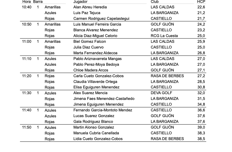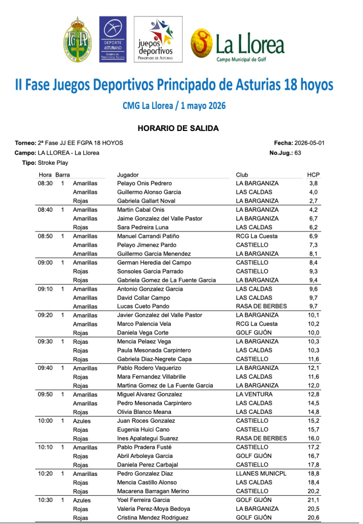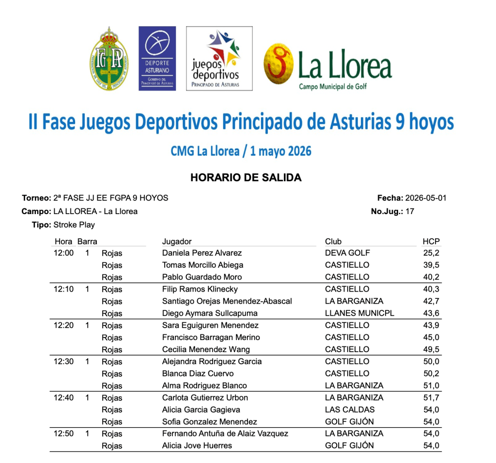 Horario de Salida II Fase JJ EE FGPA 2026 / C.M. Golf La Llorea por Golf por Asturias en 29 abril, 2026 SALIDAS 9 HOYOS SALIDAS 18 HOYOS Compártelo: Compartir en X (Se abre en una ventana nueva) X Comparte en Facebook (Se abre en una ventana nueva) Facebook Me gusta Cargando...
