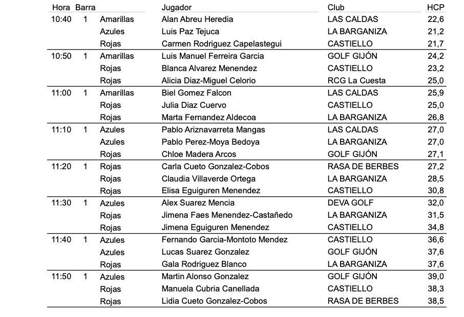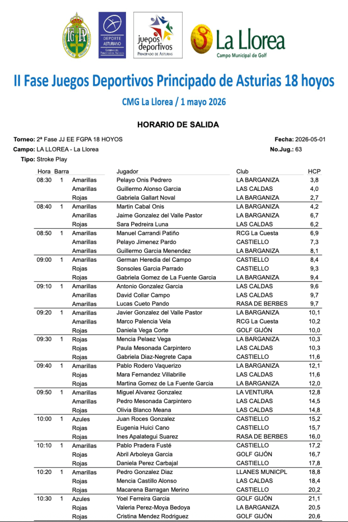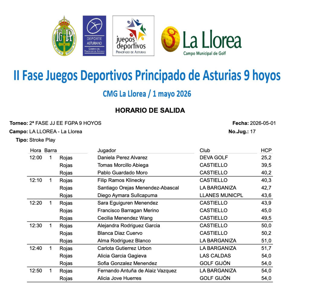 Horario de Salida II Fase JJ EE FGPA 2026 / CM Golf La Llorea por Golf por Asturias en 30 abril, 2026 SALIDAS 9 HOYOS SALIDAS 18 HOYOS Compártelo: Compartir en X (Se abre en una ventana nueva) X Comparte en Facebook (Se abre en una ventana nueva) Facebook Me gusta Cargando...