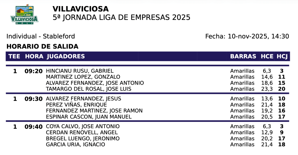 SALIDAS SABADO 2º JORNADA LIGA OPEN 25/26 – CIERRO GRANDE GOLF
