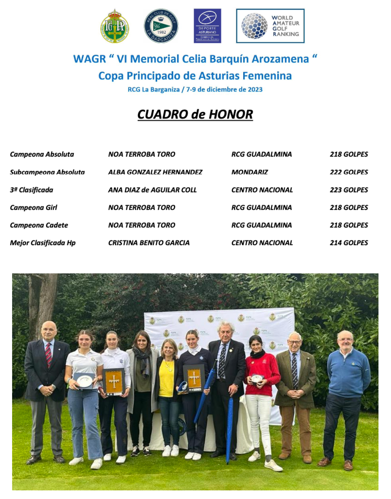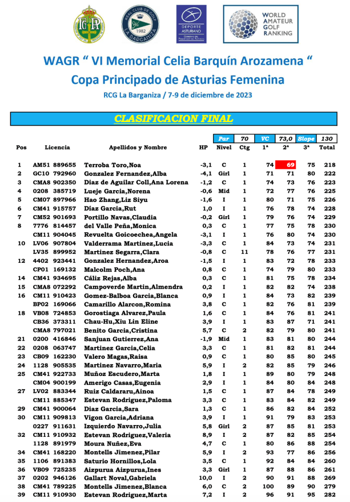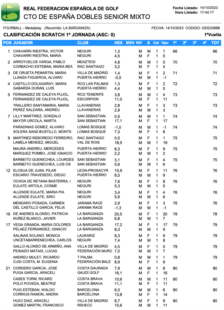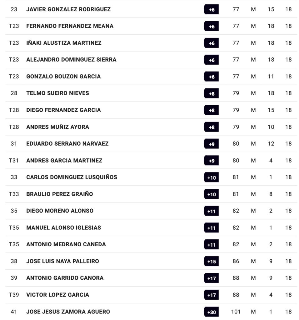 El profesional gallego Luis Manuel Portela colídera con el asturiano esta primera vuelta, en la tercera plaza nos encontramos a otro asturiano Esteban Vazquez con dos golpes más, Alex Garcia con 74 en su tarjeta se coloca en el puesto 12º al igual que Nicolas Dopico, Manuel Fernandez con 76 golpes es 17º, puesto 23º para Fernando Meana con 77 golpes, con 78 golpes tenemos a dos asturianos, Diego Fernandez y Andres Muñiz en el 28º y tarjeta de 101 golpes para Jose Jesus Zamora finaliza en el puesto 41º
