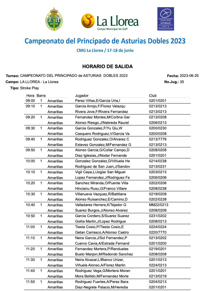 Horarios salida primera jornada del Campeonato de España Dobles Senior Mixto, resaltar las partidas 1, 2, 6 y 19, donde participan parejas mixtas asturianas
